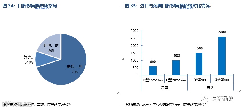 公司独家口腔修复膜质优价廉,国产替代趋势清晰。目前口腔修复材料逐渐形成生物材料的替代趋势,其中口腔生物膜类随着种植牙行业的发展呈现高速增长。目前主要由进口产品垄断市场,其中,瑞士企业盖氏独占约70%份额,正海生物的独家海奥牌口腔修复膜市占率约10%。根据临床研究来看,海奥口腔修复膜性能不劣于进口产品,且相比进口产品单价优势明显,预计正海口腔修复膜国产替代进程有望加快。