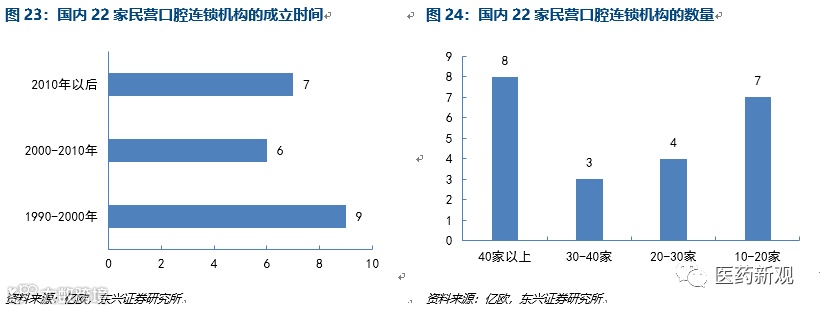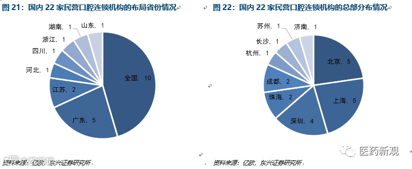 口腔医疗消费市场结构区域化明显,民营资本涌入经济发达区域。口腔医疗为消费医疗,相比普通医疗而言,拥有更多的消费属性。口腔医疗服务在拥有更大消费能力的一线二线城市发展迅速。22家的民营口腔连锁机构中的10家口腔机构在全国范围内进行布局,其余5家在广东布局,2家在江苏布局。22家口腔机构中有14家的总部位于北京、上海、深圳一线城市,在珠海、成都分别有2家。