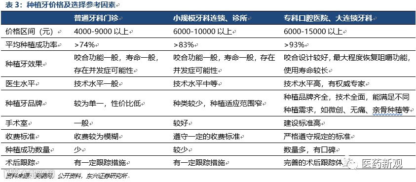 口腔医疗机构服务遵循就近原则,种植业务依托“医生+设备”的高端服务能力。通过对公立、民营医院分类比较来看,除公立口腔专科医院的服务能力辐射全国外,综合医院口腔科、连锁口腔医院(诊所)、个体口腔诊所均遵循就近服务原则,服务覆盖约5公里范围。同时,医疗机构需配置高端硬件设施与高水平的医生,才能开展种植、正畸、颌面外科等诊疗服务。高端口腔医疗服务能力的需求提升,也将促进口腔专科医院、综合服务能力强的连锁口腔医院(诊所)不断发展。