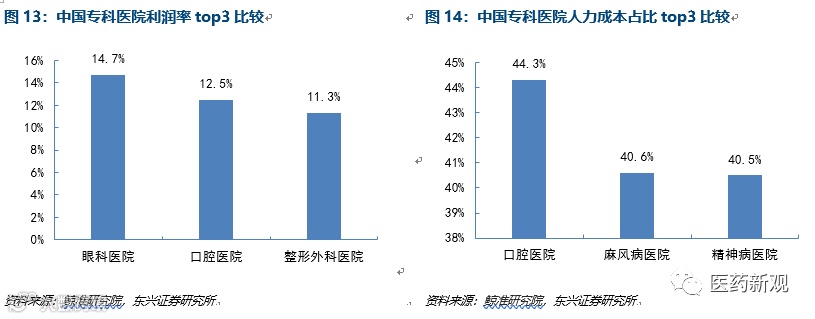 口腔医院利润率位列第二,人力成本占比最高。通过比较专科民营医院的利润率与人力成本占比指标,口腔医院的人力成本占收入比例最高,达到44.3%,但利润率约为12.5%,位列第二,仅次于眼科医院,这表明口腔医院对医生的依赖度大,需要保证相关科室医生的供给以满足医疗服务需求,且口腔科医生的人均盈利高,给口腔医院培养医生、扩张业务提供较大动力。