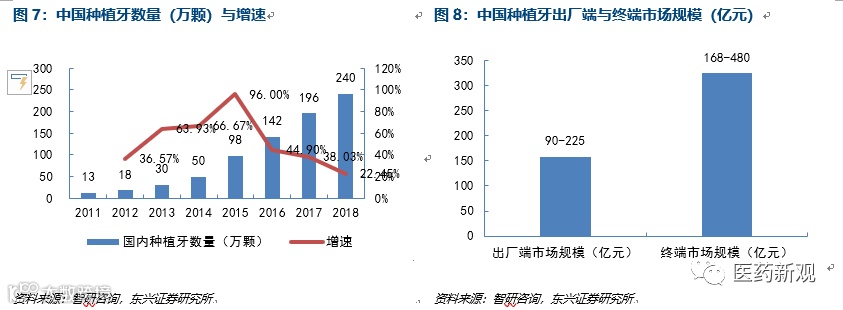 国内种植牙年使用量达240万颗,七年复合增速52%。在2011年-2018年,国内种植牙数量由13万颗增长到约为240万颗,复合增长率达到51.7%。根据市场价格来看,单颗牙的出厂价约3750-9375元,终端市场价格约7000-20000元,种植牙的出厂端市场规模约90-225亿元,终端市场规模约168-480亿元。