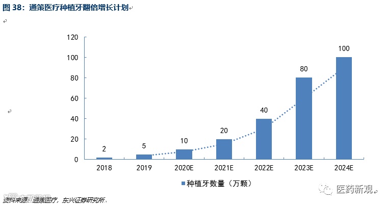 受益于种植牙行业的高速增长,公司提出倍增计划。预计在2019年,公司种植牙数量有望达到5万颗,预计5年内,种植牙数量按照每年倍增的速度增长至100万颗。随着种植牙规模化的发展,未来种植牙的降价趋势将逐渐明显,单价在1万元以上的高端种植牙预计降价至约7000元左右,未来100万颗种植牙贡献收入合计约70亿元以上。