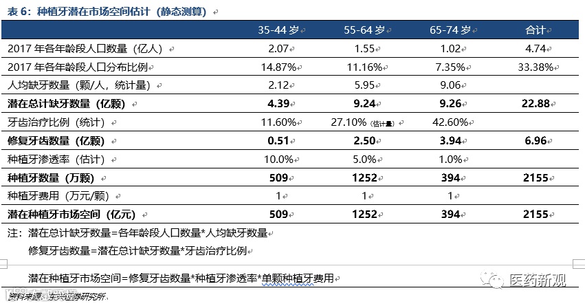 总计缺牙数达到22.88亿颗,潜在种植牙市场空间达到2155亿元。根据35-44岁、55-64岁、65-74岁人群平均缺牙情况来看,全国潜在总计缺牙数量分别为4.39亿颗、9.24亿颗、9.26亿颗,合计达到22.88亿颗。其中,35-44岁、55-64岁、65-74岁人群的牙齿治疗比例分别为11.60%、27.10%、42.60%,以此测算修复牙齿数量为0.51亿颗、2.50亿颗、3.94亿颗;假设种植牙的渗透率分别为10%、5%、1%,测算得到种植牙数量分别为509万颗、1252万颗、394万颗,合计2155万颗。按每颗种植牙1万元的价格估算,潜在市场空间约为2155亿元。