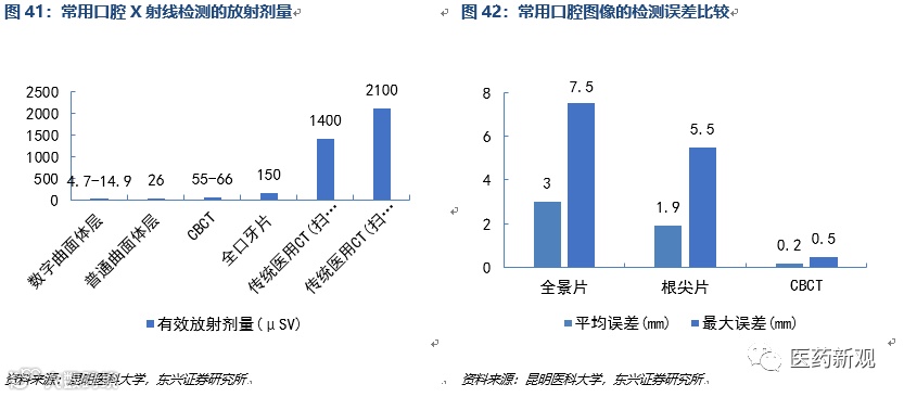 在口腔医疗领域技术优势明显,可替代传统螺旋式 CT、全景机。CBCT的空间分辨率高,图像拍摄误差更低。临床数据研究显示,CBCT的诊断平均误差仅为0.2mm,最大误差仅为0.5mm,相比全景片、根尖片检测精确度更高。CBCT的放射剂量仅为55-66uSV,比较全景机放射剂量在150uSV,传统CT的放射剂量在1400-2100uSV,使用更加安全可靠。