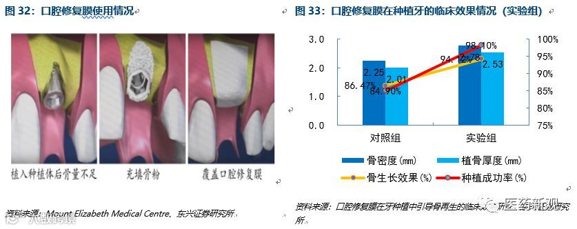 引导骨再生术治疗骨量不足,口腔修复膜可提高种植牙成功率。在临床种植牙手术中,患者骨量充足实现种植体固位是手术成功的关键因素之一。引导骨组织再生术(Guided Bone Regeneration, GBR)作为增加牙齿或种植体周围骨量的成熟技术,其中口腔修复膜对营造骨再生有利的环境不可或缺,根据临床研究来看,使用修复膜的实验组患者的骨厚度、骨生长效果、种牙成功率明显高于对照组。