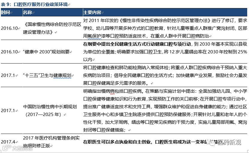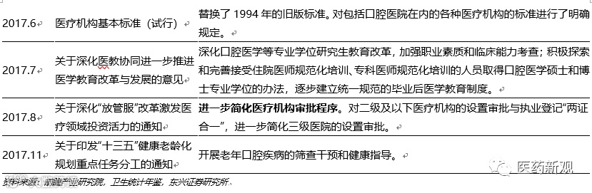 政策面持续支持国内口腔医疗行业发展,推动牙科医生供给改善。2016年以来,国家层面出台一系列口腔医疗相关政策,以促进口腔医疗行业发展,提高人民口腔医疗健康水平。
