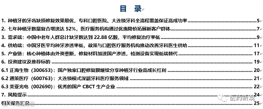 上文我们分析了口腔种植牙板块的现状与发展潜力,我们建议关注围绕种植牙领域的产业链投资机会,尤其是上游设备和耗材,企业通过持续创新发展驱动国产替代,推荐关注正海生物、美亚光电;下游口腔专科医疗服务的大连锁模式促进行业集中度不断提升,推荐关注通策医疗。