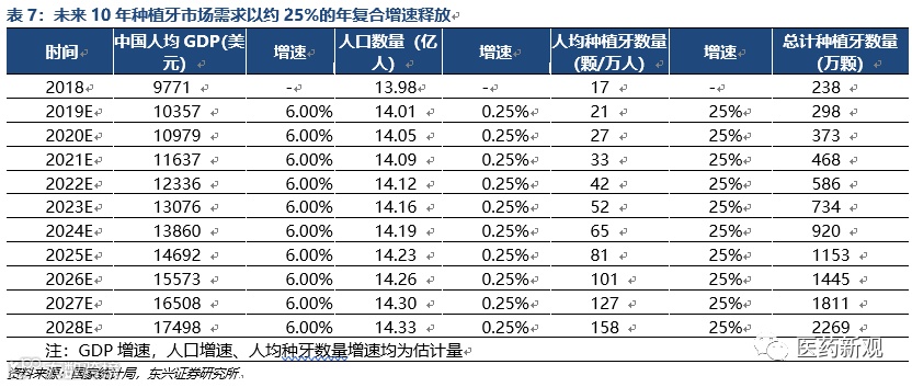 我们对未来植牙量的预测:未来10年年均复合增速为25%。我们假设到2019年-2028年十年间,潜在2155万颗种植牙需求数量将逐渐释放。预测数据如下: