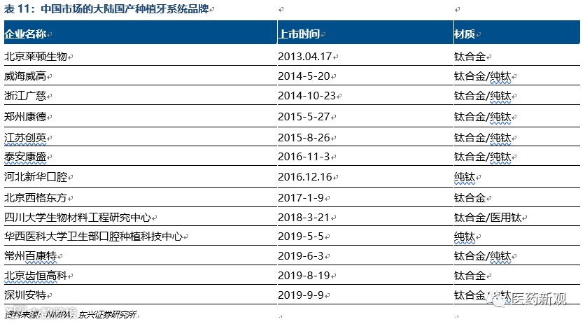 外资企业垄断中高端种植体市场,在中低端市场上,进口种植体在技术水平较好、依然有较强的客户黏性。目前国内共有13个国产种植体品牌获批上市,上市产品主要定位在低端市场,医疗机构自主研发的种植体,以自用为主。目前已经有北京莱顿BLB、威高WEGO、江苏创英等企业的品牌已经逐渐获得医疗机构与患者的认可。