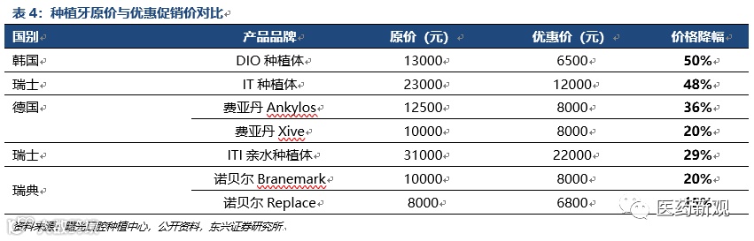 医疗服务机构通过优惠降价拓展种植牙客户群体。随着种植牙市场规模的扩大,为进一步促进市场需求的释放,生产企业、医疗服务机构通过成本管控、优惠补贴等手段实现终端价格的下降,通过医院、医生的推介、广告等来提升客户对种植牙的认知,通过降幅明显的优惠价来吸引客户选择种植牙修复方式。