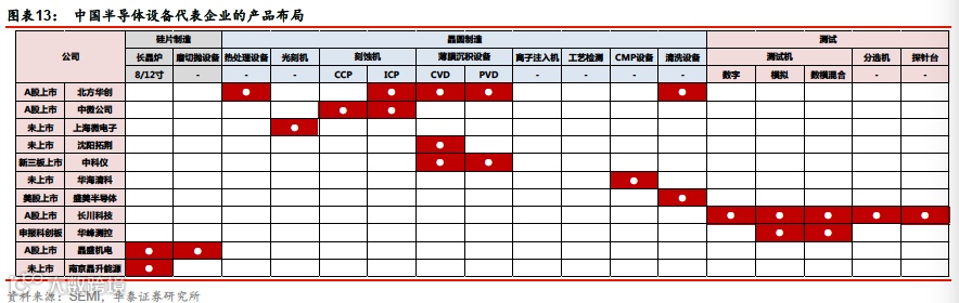 1)测试设备(受益于中国大陆封测产业崛起和设计公司对产业链的国产化需求提升)、单晶硅生长设备(受益于大陆晶圆产能增加,硅片供需缺口加大,本土硅片厂项目落地)比较接近国际先进的技术水平,国产化进程较快;