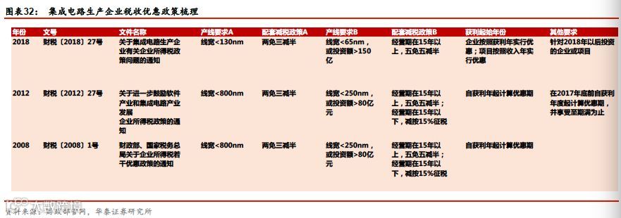 国内近年已出台集成电路产业税收减免政策,主要针对获利初期的企业及项目。财政部先后于2008、2012、2018 年出台税收政策减免集成电路生产企业所得税,对2018 年以后投资新设企业或项目:1)线宽<130nm 且经营期在10 年以上的,第1~2 年免征企业所得税,第3~5 年减半征收企业所得税;2)线宽<65nm 或投资额>150 亿元,且经营期在15年以上的,第1~5 年免征企业所得税,第6~10 年减半征收企业所得税。2015 年财政部