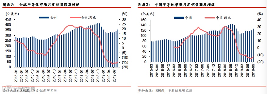 全球及中国半导体市场需求或已进入筑底阶段。2019 年来受全球宏观经济承压、消费电子下游需求减弱等因素影响,国内外半导体市场销售额均出现了同比下滑。据SEMI 数据,全球、中国市场单月销售额分别于2019 年4 月、2 月跌至近两年最低点,此后均进入环比回升通道,截至2019 年9 月单月销售仍明显低于上年同期,但同比增速的下滑幅度已经有所企稳。受益于5G、物联网(IoT)、人工智能(AI)等新一轮技术变革所带来的增量需求,我们认为2019Q4~2020 年半导体下游需求具备复苏条件。