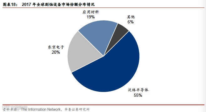 刻蚀设备行业集中度较高,泛林半导体占据刻蚀机市场份额半壁江山。随着半导体技术进步带来器件互连层数增多,介质刻蚀设备的使用量不断增大,泛林半导体利用其较低的设备成本和相对简单的设计,逐渐在65nm 、45nm 设备市场超过TEL 等企业,占据了全球大半个市场,成为行业龙头。根据The Information Network 的数据显示,泛林半导体在刻蚀设备行业的市占率自2012 年起逐步提高,从2012 年的约45% 提升至2017 年的约55% ,主要替代了东京电子的市场份额,东京电子的市场份额从2012 年的30% 降至2017年的20% ,但仍然保持第二的位置。应用材料始终位于第三,2017 年约占19% 的市场份额。前三大公司在2017 年占据总市场份额的94% ,行业集中度高,技术壁垒明显。
