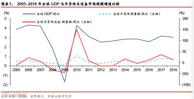 全球半导体、半导体设备行业景气度与全球GDP 增速相关性较高,但波动幅度更大。半导体行业虽然有科技革命驱动,但也会受到全球经济的影响而出现周期性波动。通过数据,我们可以发现2005~2018 的十几年里,半导体及设备市场规模波动性较大,且与全球经济的景气度密切相关。