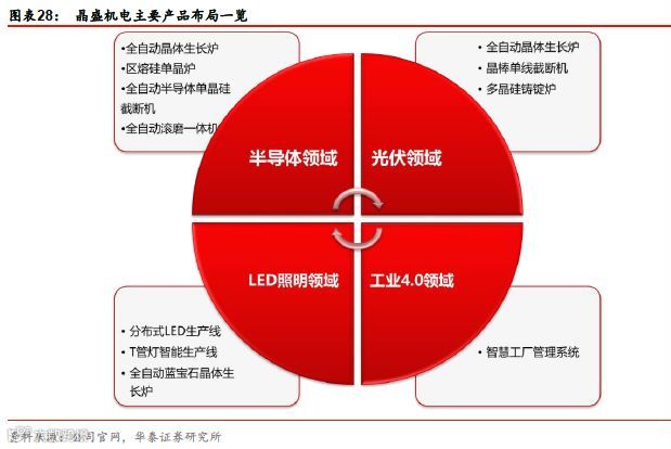 公司主营产品为全自动单晶炉、多晶铸锭炉等,应用于太阳能光伏、集成电路、LED 等新兴产业。公司较早掌握了国内领先的半导体硅材料生长的装备技术,在半导体领域实现了8~12 英寸大硅片制造用晶体生长及加工的核心装备国产化。公司产品覆盖晶体生长、切磨抛和监测等各个环节,已逐步从单一的设备制造商转型成了立足于“新材料、新装备”的国际领先的设备供应商和高端晶体材料生产商。
