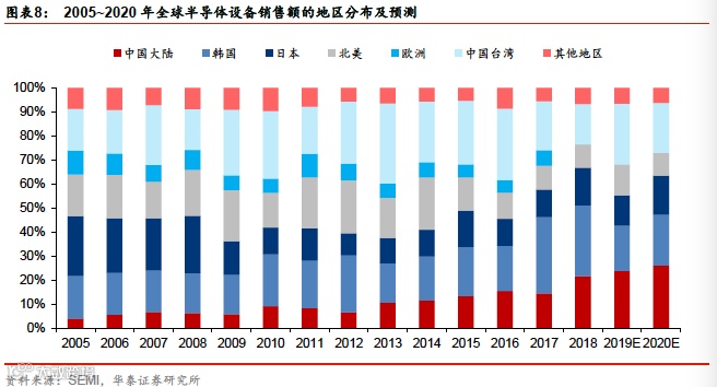 2008~2018 年,全球半导体设备市场的地区分布不断变化。2016 年中国台湾以122 亿美元市场规模位居榜首,2018 年韩国则以177 亿美元设备销售跃居第一,中国大陆、中国台湾分别以131、102 亿美元紧随其后。据SEMI 预计,2019~2020 年韩国、中国大陆、中国台湾将分列世界前三大设备市场,2020 年中国大陆有望升至全球最大设备市场。值得关注的是,作为全球半导体最具活力和发展前景的市场区域之一,中国大陆市场的全球比重总体呈显著上升趋势,由2005 年的4%提高到2018 年的20%,据SEMI 预测,2019、2020 年中国市场的全球占比有望大幅提升到22%、25%。
