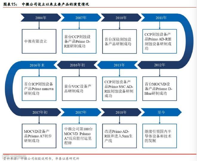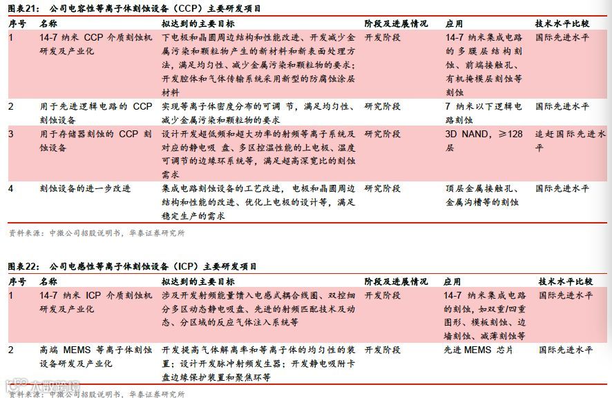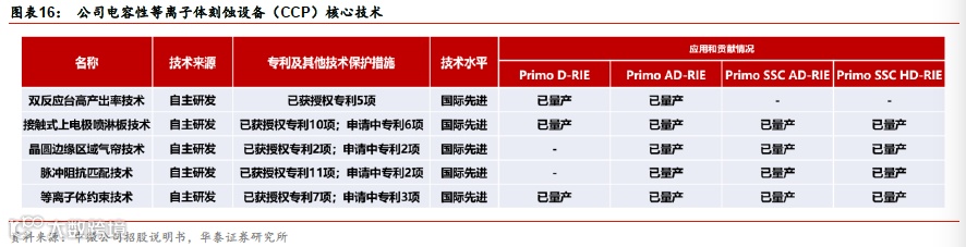 公司的刻蚀设备技术处于世界先进水平,符合产业发展趋势。在逻辑集成电路制造环节,公司开发的高端刻蚀设备已运用在国际知名客户最先进的生产线上并用于7 纳米器件中若干关键步骤的加工;同时,公司根据先进集成电路厂商的需求优化5 纳米及更先进的刻蚀设备和工艺。在3D NAND 芯片制造环节,公司的电容性等离子体刻蚀设备技术可应用于64 层的量产,同时公司根据存储器件客户的需求正在开发极高深宽的刻蚀设备和工艺;公司也根据逻辑器件客户的需求,正在开发更先进的大马士革等刻蚀应用的设备。由于公司开发出与美国设备公司具有同等质量和相当数量的等离子体刻蚀设备并实现量产,美国商务部在2015 年宣布解除了对我国等离子体刻蚀设备多年的出口管制。(资料来源:公司招股说明书)据公司2019 中报,2019 年以来,公司CCP 刻蚀机优势持续强化,ICP 刻蚀机实现量产突破。