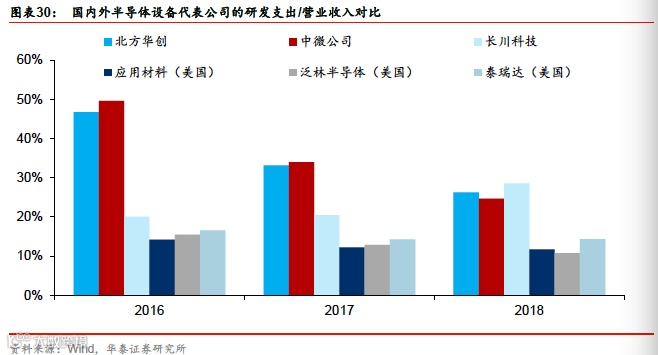本土企业的研发投入占比超过海外龙头,但在投入规模上与海外龙头仍存在很大差距。本土企业作为后进者,在技术追赶过程中需要的研发投入相比收入体量来说很高,2018 年北方华创、中微公司、长川科技研发支出的收入占比分别为26% 、25% 、29% ,明显高于同期应用材料、泛林半导体、泰瑞达12% 、11% 、14% 。但另一方面,目前和海外龙头研发投入的绝对值来看,本土企业的研发投入还很不足,2018 年应用材料研发支出达北方华创的16 倍,泛林半导体研发支出达中微公司的19 倍,泰瑞达研发支出达长川科技的34 倍。