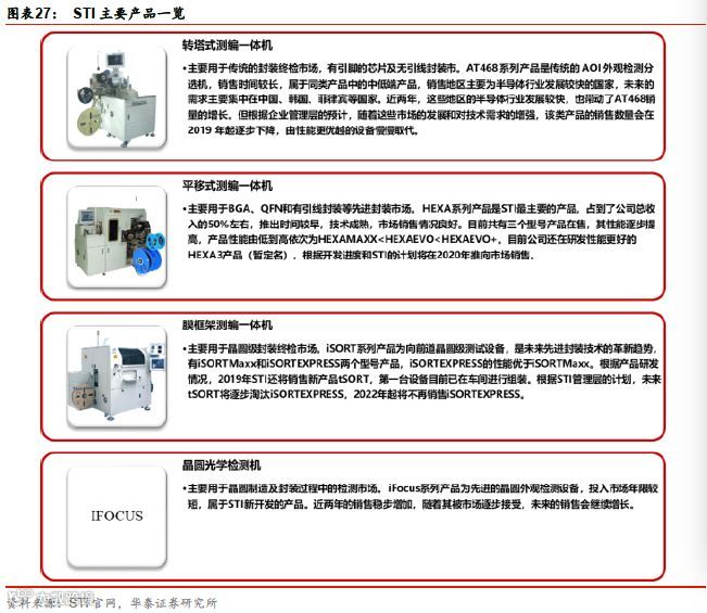 STI 是研发和生产为芯片以及晶圆提供光学检测、分选、编带等功能的集成电路封装检测设备商。STI 的主要产品有转塔式测编一体机、平移式测编一体机、膜框架测编一体机和晶圆光学检测机。STI 产品的下游客户包括德州仪器、美光、意法半导体、三星等大型半导体生产公司及日月光、安靠技术等世界一流的半导体封装和测试外包服务商,具备领先的客户优势。(资料来源:长川科技发行股份购买资产暨关联交易报告书)
