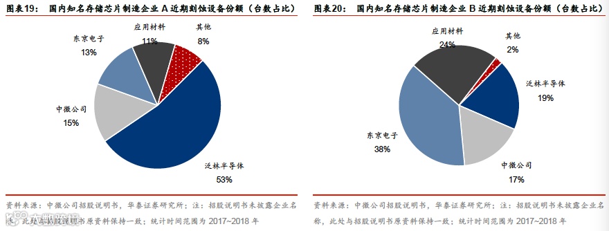 我们认为,中国国产CCP 刻蚀机有望对应用材料、东京电子等海外龙头的同类产品逐步实现替代。中微公司的刻蚀设备虽然在销售规模上离全球半导体设备巨头尚有一定差距,但其部分技术水平已达到国际同类产品的标准,并已应用于全球最先进的7 纳米和5 纳米生产线。据公司招股说明书,2017~2018 年两家国内知名存储芯片制造企业采购的刻蚀设备台数订单份额中公司分别占比达15% 、17% 。公司自主研发的刻蚀设备正逐步打破国际领先企业在国内市场的垄断,已被海内外主流集成电路厂商接受。
