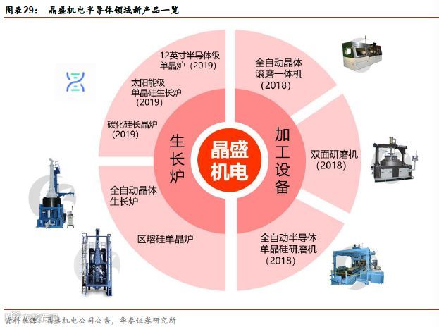 1 )前道晶体生长设备(单晶炉):据公司公告(编号2019-005 ),公司承担的国家科技重大专项“极大规模集成电路制造装备及成套工艺”项目的“300mm 硅单晶直拉生长装备的开发”和“8 英寸区熔硅单晶炉国产设备研制”两项课题,已进入产业化阶段,8 、12寸半导体单晶炉已获得中环股份、金瑞泓、合晶等国内半导体硅片企业订单,并陆续交付;