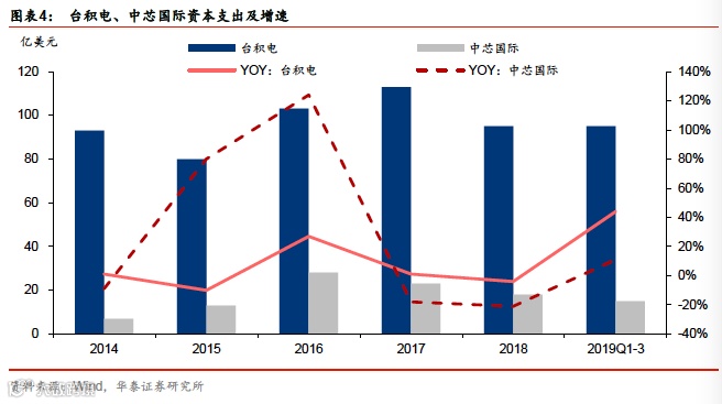 1 )晶圆厂资本开支是半导体设备需求的直接影响因素,2018 年台积电、中芯国际等晶圆厂资本支出均较上年同期有所下滑,但从2019 年前三季度来看,上述企业的资本支出已出现明显同比增长,台积电、中芯国际增幅分别达44% 、11% 。据IC Insights 预测,三星、台积电2019Q4 单季资本支出有望创下历史新高。