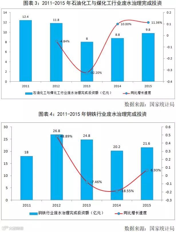 在钢铁焦化领域,“十二五”期间废水排放量49.8亿吨,预计“十三五”期间废水排放量51.8亿吨,市场容量115.9亿元,预计投资增长4%,提标改造81.1亿元。