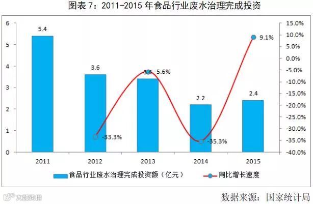 在食品工业领域,“十二五”期间废水排放量28.6亿吨,预计“十三五”期间废水排放量30.6亿吨,市场容量18.2亿元,预计投资增长7%,提标改造4.6亿元。