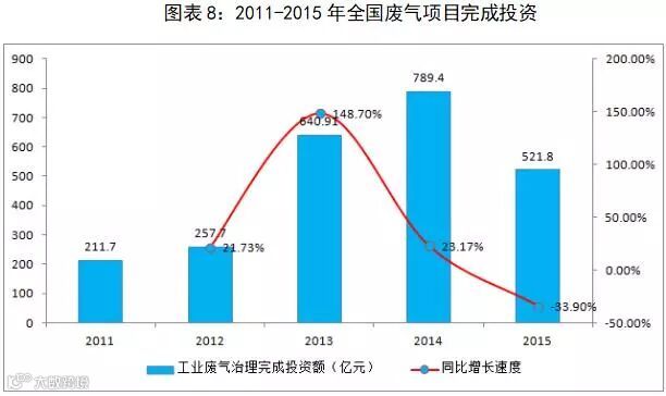 我国工业废气处理主要是电厂、矿山、化工、冶金、煤炭、能源等领域脱硫、脱硝、除尘等环境治理。工业废气排放主要是二氧化硫、氮氧化合物排放和工业烟(粉)尘排放等。其中,SO2、氮氧化合物排放治理是烟气处理的重点。2015年,全国废气二氧化硫排放量1859.1万吨,其中工业二氧化硫排放量为1556.7万吨,占排放总量的83.7%;全国废气排放中氮氧化物排放量1851.9万吨,其中工业氮氧化物排放量为1180.9万吨,占排放总量的63.8%;全国废气烟(粉)尘排放量1538.0万吨,其中工业烟(粉)尘排放量为1232.6万吨,占排放总量的80.1%。根据环保部《全国环境统计公报》,“十二五”期间我国废气治理完成治理投资额2421.5亿元。预计“十三五”期间,工业废气治理投资额3000亿元以上,年均增长8%。特别是随着《大气污染防治行动计划》(2013年)的实施,中央政府和各级政府的治理承诺给大气污染治理行业的发展注入了强劲动力,政府引导投资促进产业发展,大气污染治理市场空间提升,“节能减排”、“提标排放”、“近零排放”措施的实施,带来广阔的市场空间,未来烟气治理领域呈现出更为持续快速发展的局面,烟气污染治理领域迎来新的更多的投资机遇。