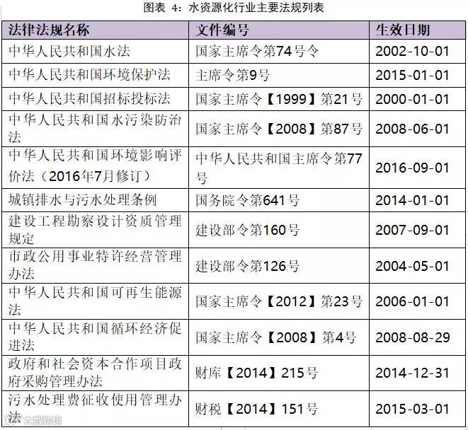 我国是一个水资源严重缺乏的国家,水资源的利用和保护是我国环境保护的重中之重,也是我国的基本国策。水资源化行业主要法规如下: