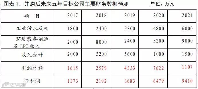 并购后目标公司市场状况良好,按目标公司拓展工业污水处理及相关烟气、固废市场和承接某环境装备制造和EPC业务测算,预计并购后目标公司经营业绩呈较大幅度增长,2020年(“十三五”末)实现营业收入10亿元,2021年(并购后第五年)实现营业收入15亿元(并购达产目标),经营利润同步增长,企业步入良性循环、稳步发展经营轨道,成为某公司第二大经营支柱产业和环境产业的骨干企业、梯次配套优势企业和业务支撑。