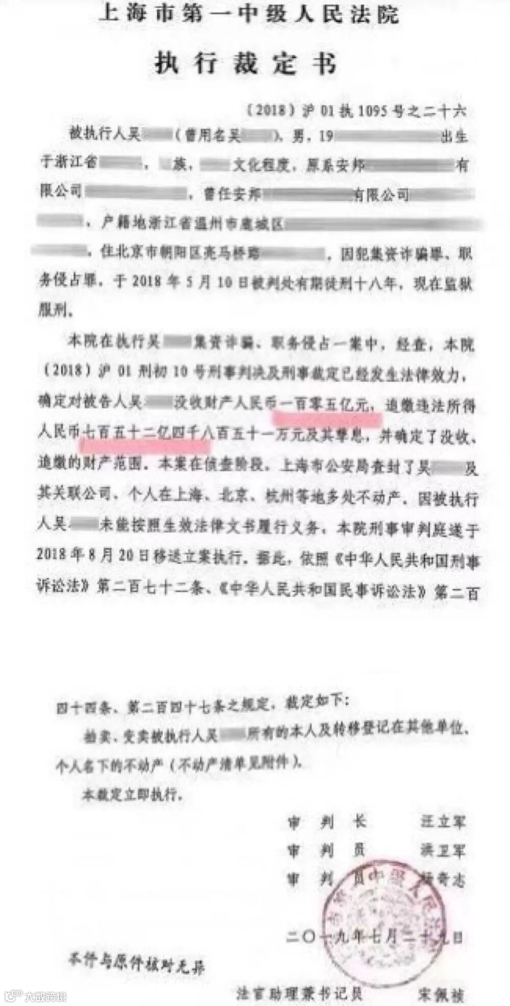 随之,对安邦和吴小晖的处置程序陆续启动并完成。最新的信息是,网传上海市第一中级人民法院已经以(2018)沪01执1095号之二十六《执行裁定书》对吴小晖的财产进行了处置。具体处置方案为:没收财产人民币一百零五亿元,追缴违法所得人民币七百五十二亿四千八百五十一万元及其孳息,并确定了没收、追缴的财产范围。