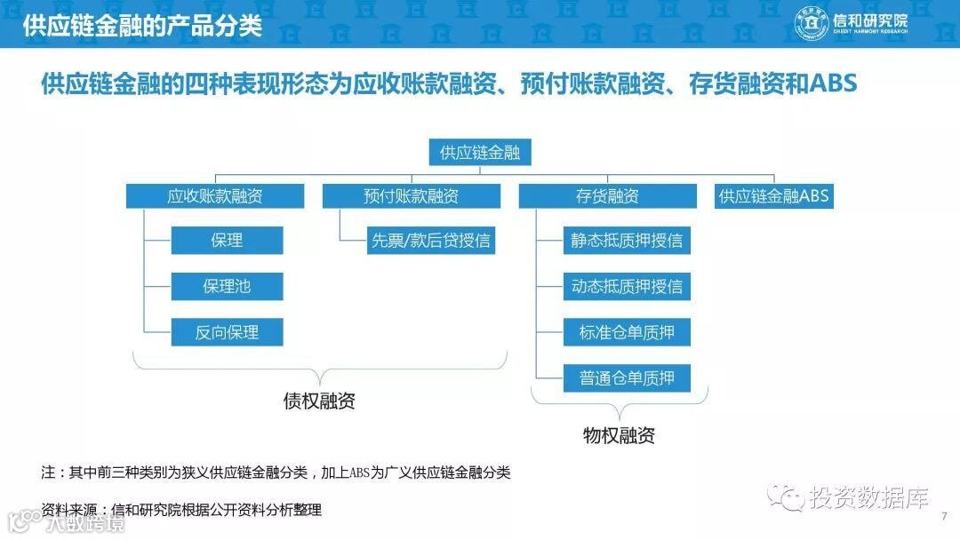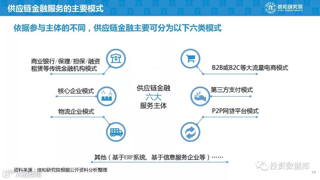 供应链金融产品根植于供应链条的各个环节,依据参与主体的不同,供应链金融可分为六类主要模式,其中,核心企业、第三方支付、物流企业、电商