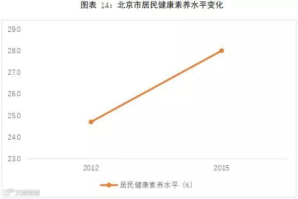 根据《2015年度北京卫生与人群健康状况报告》,2015年北京市居民健康素养水平为28.0%,比2012年(24.7%)提高13.4%。