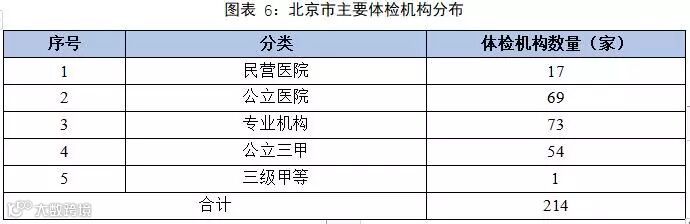 截止2016年底,北京市范围内共有体检机构214家。其中,专业体检机构数量最多,为73家,其次为公立医院,为69家,具体数据见下表。