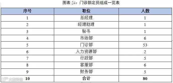 按照接待人数与员工的比例配备,需要配备员工80人。其中总经理1人,经理助理1人,秘书1人,市场部6人,门诊部53人,人力资源部2人,行政部5人,客服部6人,财务部5人,具体如下表所示: