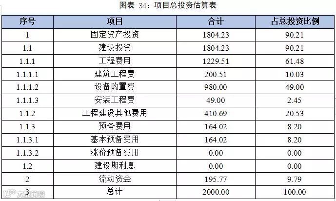 项目总投资2000.00万元,其中,固定资产投资1804.23万元,流动资金195.77万元。固定资产中,工程费用1229.51万元,工程建设其他费用410.69万元,预备费用164.02万元。