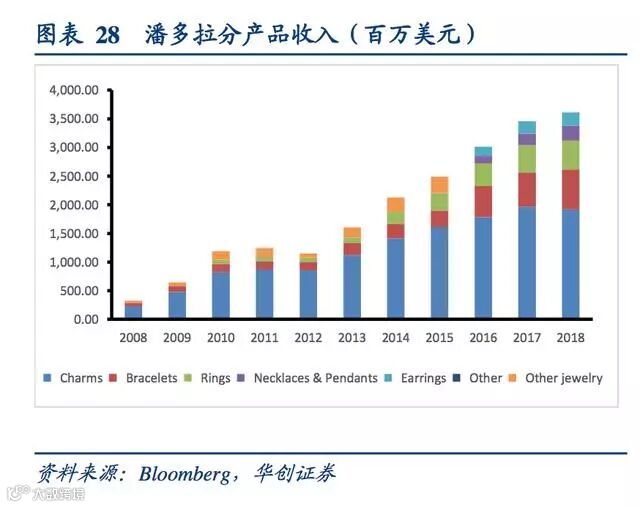 从产品构成上来看,实行多样化战略。潘多拉串珠和手链市场已经很坚挺,拓展戒指、项链吊坠、耳饰等新产品助收入增长。