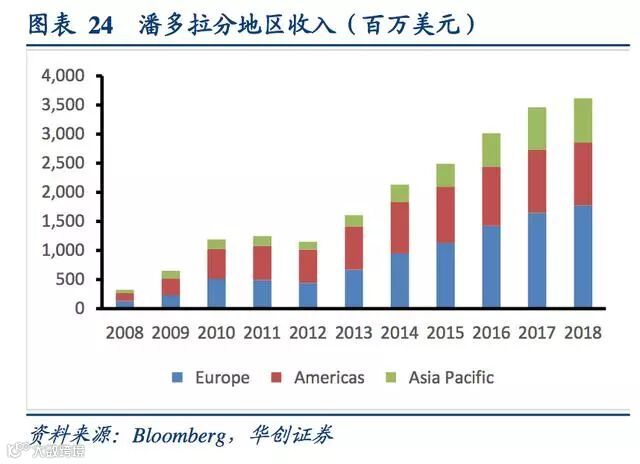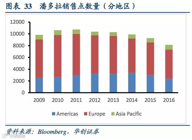 潘多拉的销售点众多,2011年达到顶峰10732家店,2018年7728家店。2012年以来销售点数量逐年下降,主要源自其银店和旅游零售店的大量减少,而概念店等品牌销售点仍在增加,这是其控制销售网络的品牌计划的一部分。公司销售点主要集中于欧洲和美洲地区,与其营收份额对应。2016年分别占比61%、29%。亚太地区的占比逐年提升。
