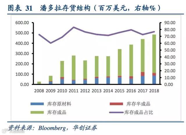 潘多拉自2010财年来存货周转率在1.3-2.3间波动并逐渐趋于平稳,存货占用水平较低,流动性趋稳。产品更新速度快,存货周转率在行业内处于较高水平。从存货结构来看,潘多拉的库存成品居多,占据所有库存的六至八成,其次为库存原材料,且占比基本维持稳定。