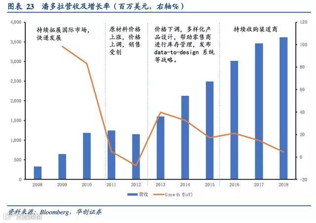 渠道端,潘多拉的销售点众多,2011年达到顶峰10732家店,2018年7728家店。公司通过先扩张后整合的渠道战略实现了收入的进一步跃进。