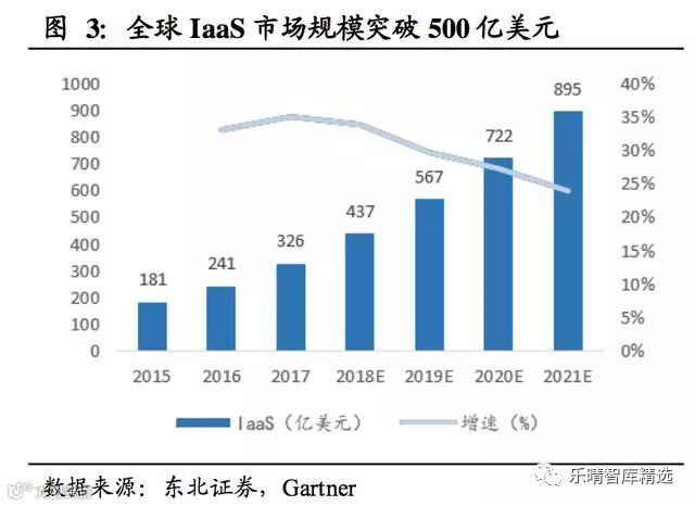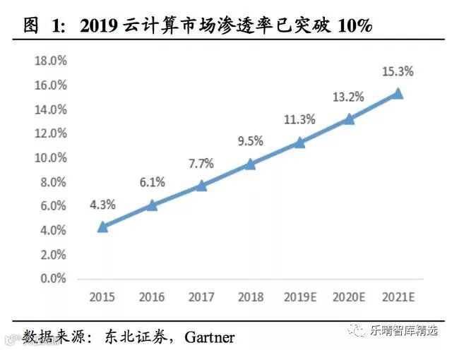 据Gartner数据,2019年全球云计算市场渗透率将首次突破10%。哈里·S·登特提出新技术周期中,行业渗透率突破10%后会进入加入发展阶段,渗透率在10%-50%是最具投资价值的阶段。