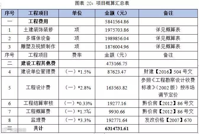 本项目共包含3个子项目,分别为土建装饰装修工程、多媒体设备工程、雕塑及视频制作工程,各部分投资估算如下(概算书):