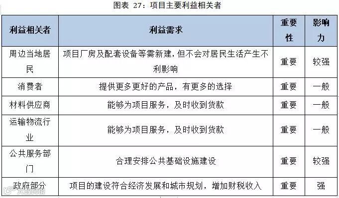 根据项目的特点,对项目主要利益相关者有周边当地居民、消费者、施工企业、材料供应商、运输物流行业、公共服务部门、政府部门等。分析如下所示: