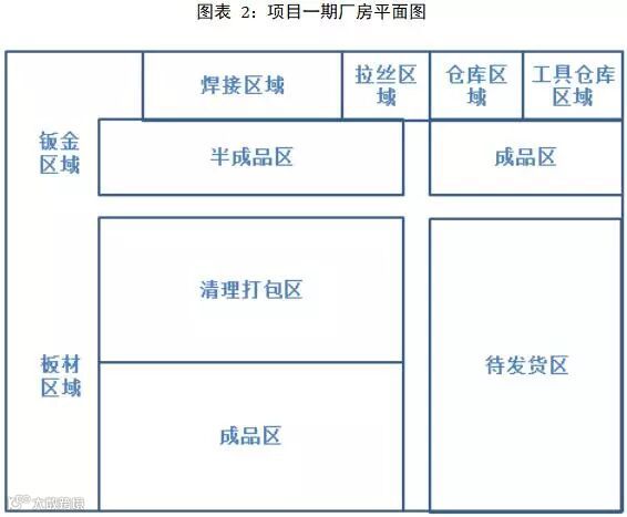 项目一期采用租赁现有厂房形式,租赁厂房面积4235.84平方米。厂房内部根据生产要求,划分为板材区域、钣金区域、焊接区域、拉丝区域、仓库区域、工具仓库区域、半成品区、清理打包区、成品区、待发货区。项目一期厂房平面布置图如下: