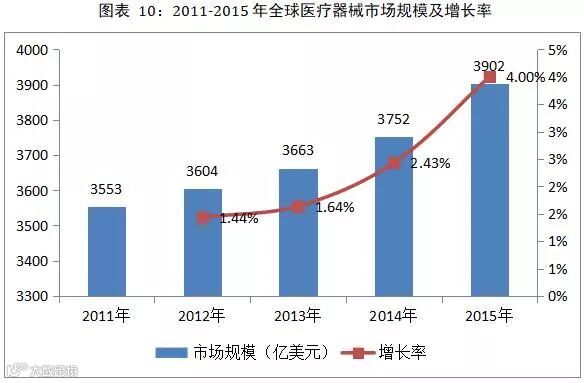 根据EvaluateMedTech的统计,2015年全球医疗器械销售规模为3903亿美元,2011-2015年全球医疗器械销售规模稳步增长,复合增长率(CAGR)为1.90%。预计该市场规模在2020年增长至4775亿美元,2015-2020期间将呈现4.1%的年均复合增长率。