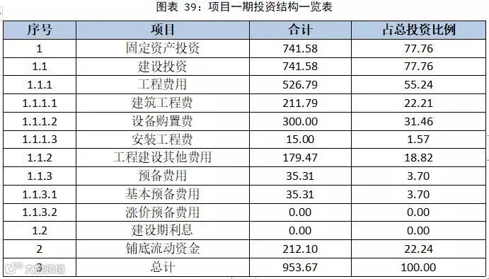 项目一期总投资953.67万元(含前两年流动资金),其中建筑工程费211.79万元、设备购置费300.00万元、安装工程费15.00万元、工程建设其他费用179.49万元、预备费35.31万元、流动资金212.10万元。