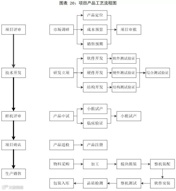 项目远程医疗设备产品均采用标准化的工艺流程生产方式,对非关键环节采取外包和采购零配件的方式完成。生产工艺流程控制如下图所示。