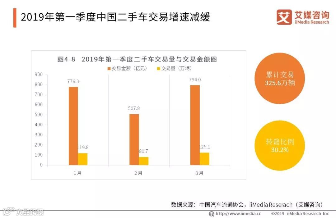 2019年一季度全国累计完成交易二手车325.6万辆,同比增长2%,交易金额为2078亿元。2019年新车市场呈现同比负增长态势,二手车市场增速明显减缓,行业进入新的调整期。受限迁政策取消的影响,一季度二手车转籍总量为98.2万辆,转籍比例为30.2%,与去年同期相比增长了8.0个百分点。